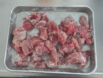 モモ肉カットしました。これも同様に塩コショウして小麦粉をまぶして焼いていきます。