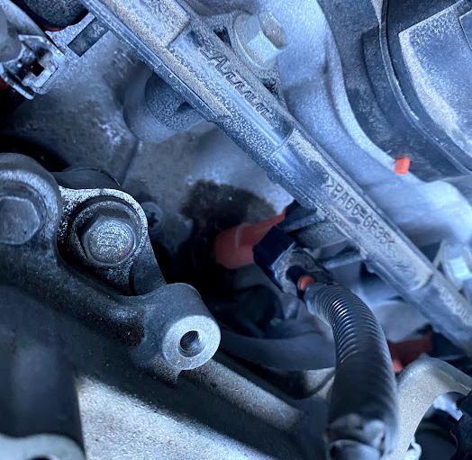 自分では対処できそうもないのでディーラーへ行ってみると、エンジンオイルを下から上に送るパイプがあって、上側の付け根の部分から漏れてることがわかりました。