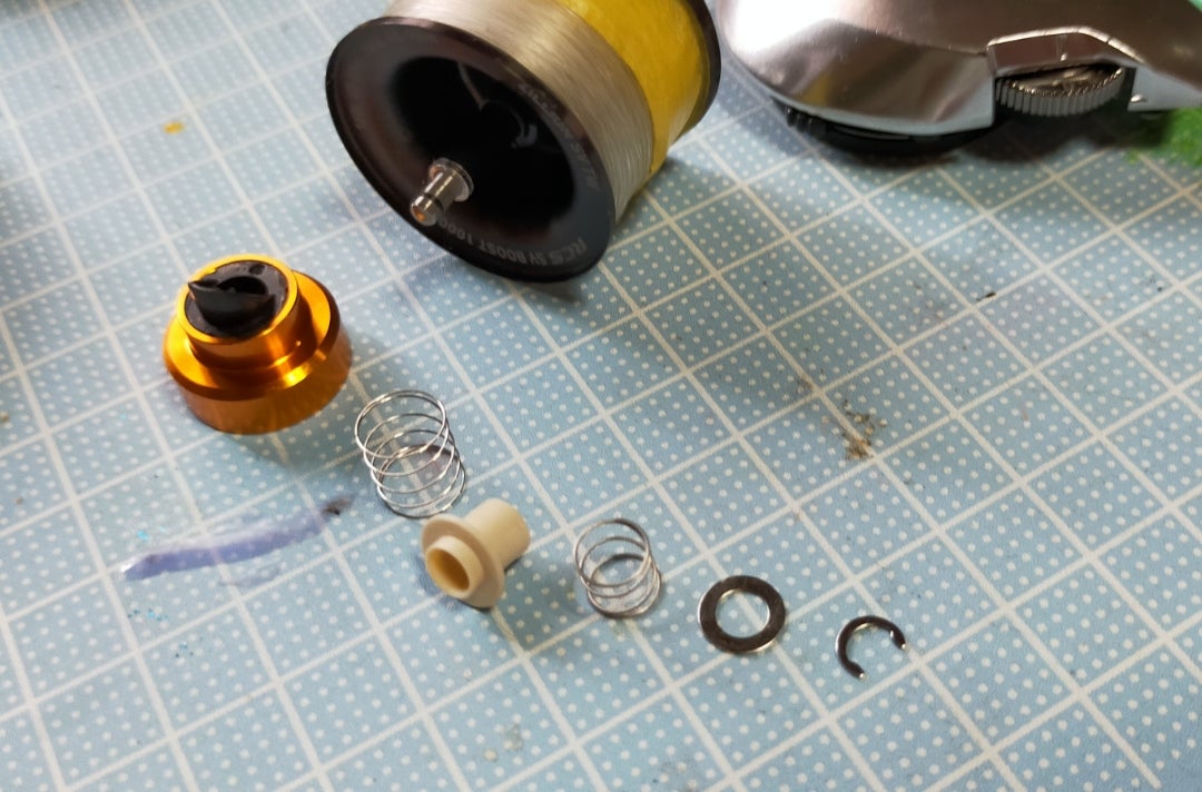 みんなひとりでやろうとしてるから大変なんだろうけど、スプールを保持する係とCリングハメる係に分かれてふたりでやれば簡単じゃね?と思って息子に手伝わせるも全くうまくいきません。