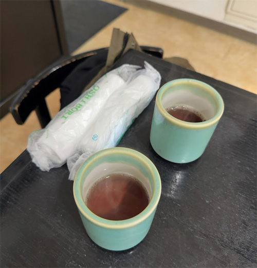 温かいお茶とおしぼり。